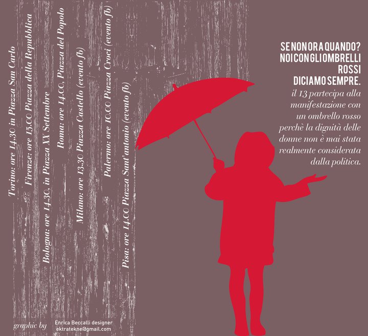 Per adesioni scrivere a femminismoasud@inventati.org oppure a ombrellirossi@grrlz.net. Chiunque stia realizzando uno spezzone dagli ombrelli rossi in qualunque città può farlo proprio (a destra potete leggere info sulle città in cui ci saranno spezzoni ribelli, liberi e indecorosi).