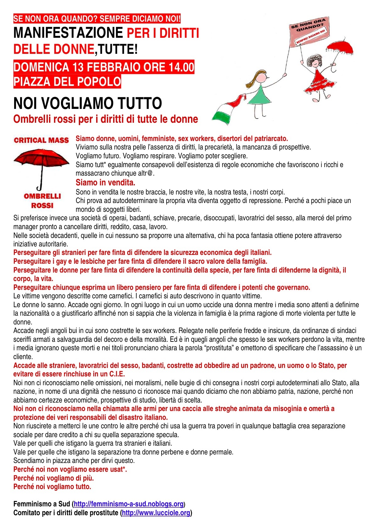 Potete scaricare il volantino in pdf per l’appuntamento a Roma dove noi, le femministe e i disertori e le sex workers saremo insieme. Da scaricare anche il logo, il banner per blog e siti, la locandina con un elenco di città con gli ombrelli rossi, il volantino in .doc da riadattare per altre città.
